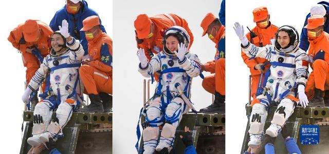 4月16日,神舟十三號載人飛船返回艙在東風(fēng)著陸場成功著陸。這是航天員翟志剛、王亞平、葉光富(左至右)安全順利出艙...